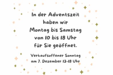 In der Adventszeit haben wir montags bis samstags von 10 bis 18 Uhr geöffnet. Verkaufsoffener Sonntag: 7. Dezember 13-18 Uhr