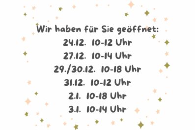 Wir haben für Sie geöffnet: 24.12. 10-12 Uhr 27.12. 10-14 Uhr 29./30.12. 10-18 Uhr 31.12. 10-12 Uhr 2.1. 10-18 Uhr 3.1. 10-14 Uhr