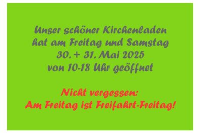 Unser schöner Kirchenladen hat am Freitag und Samstag 30. + 31. Mai 2025 von 10-18 Uhr geöffnet. Nicht vergessen: Am Freitag ist Freifahrt-Freitag!