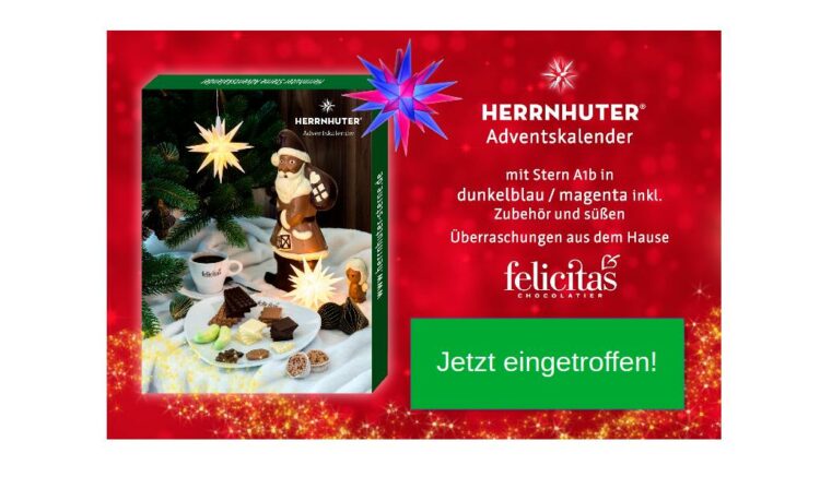 In diesem Jahr verbirgt sich hinter den Türchen ein ganz besonderer Bastelstern – denn dieser wird aus gleich 2 Sonderfarben zusammengebastelt. Die Kombination aus einem tiefen Dunkelblau und einem strahlenden Magenta lässt die Herzen höher schlagen. Im wahrsten Sinne versüßt wird die Bastelstunde mit feinster Schokolade der Confiserie Felicitas. Das notwendige Zubehör um genussvolle Bastelstunden und einen leuchtenden Herrnhuter Stern zu erhalten sind natürlich ebenfalls enthalten.