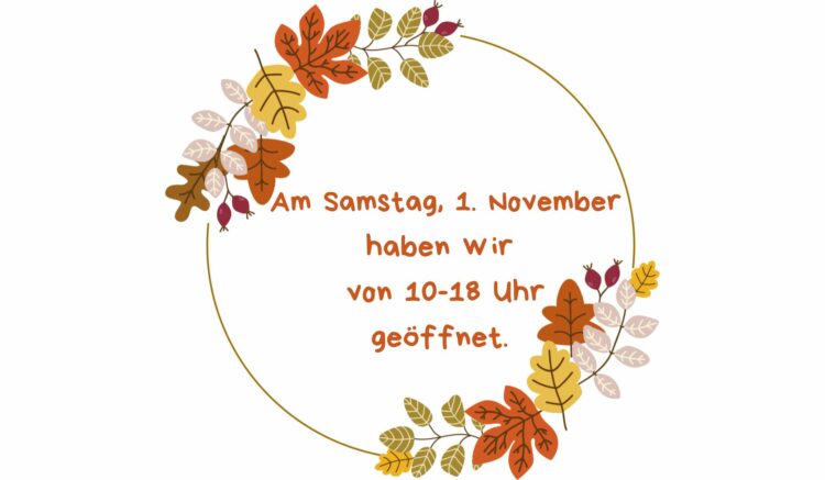Unsere Öffnungszeiten in dieser Woche: Montag-Donnerstag von 10-18 Uhr geöffnet Reformationstag, 31.10. geschlossen Samstag, 1.11. von 10-18 Uhr geöffnet